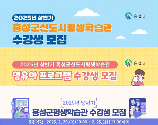 모집 기간은 2월 20일 10시부터 25일 오후 5시까지로 홍성군평생학습관과 신도시평생학습관에서 방문 접수 또는 홍성군평생학습관 홈페이지를 통한 온라인 접수로 신청할 수 있다.