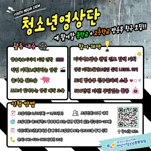 [Ytv영상스토리] 아산시청소년재단 산하 아산시청소년문화의집은 2025년 청소년영상단 단원을 모집한다.