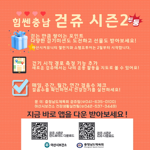 시는 이 같은 성과를 더욱 강화하기 위해 ‘걷쥬 시즌2’ 앱을 활용한 걷기 이벤트를 지속 운영하며 이벤트 보상 수단을 기존 모바일 상품권에서 ‘아산페이’로 변경해 지역 경제 활성화도 도모할 계획이다.