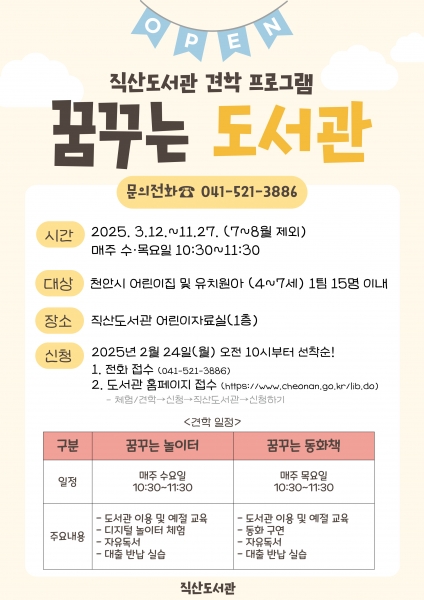 자세한 사항은 천안시 도서관 누리집을 확인하거나 직산도서관으로 문의하면 된다.