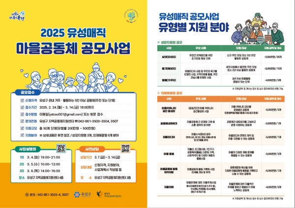 [Ytv영상스토리] 대전 유성구는 24일부터 3월 14일까지 ‘2025 유성매직 마을공동체 공모사업’에 참여할 공동체를 모집한다고 밝혔다.