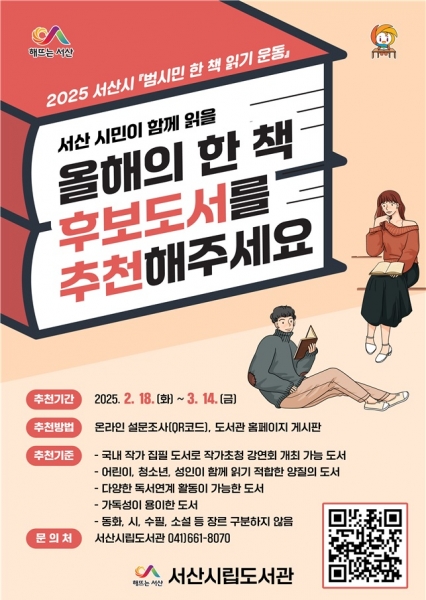 2025년 범시민 한 책 읽기 사업과 관련된 자세한 사항은 서산시립도서관에 문의하면 된다.