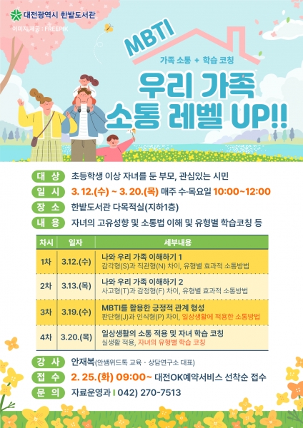 [Ytv영상스토리] 대전 한밭도서관이 부모와 자녀 간이 소통을 강화하고 맞춤형 학습 코칭을 지원하는 ‘MBTI 우리 가족 소통 레벨UP’ 프로그램을 운영한다.