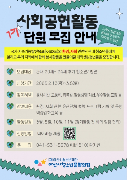 [Ytv영상스토리] 아산시청소년재단 산하 아산시청소년문화의집은 지역사회의 다양한 문제를 해결하고 자원봉사 문화를 확산하기 위한 사회공헌활동을 기획하고 운영할 1기 단원을 3월 8일까지 모집한다.
