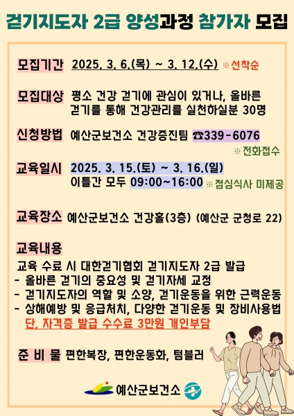 [Ytv영상스토리] 예산군보건소는 주민의 건강한 생활습관 정착과 걷기 활성화를 위해 걷기지도자 2급 양성과정 교육 참가자를 모집한다.