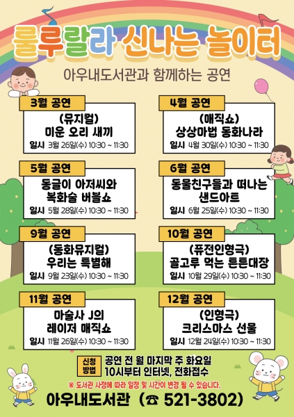 공연은 △3월, 뮤지컬 ‘미운오리새끼’ △4월, 매직쇼 상상마법 동화나라 △5월, 동글이 아저씨의 복화술 버블쇼 △6월, 동물친구들과 떠나는 샌드아트 △9월, 동화뮤지컬 ‘우리는 특별해’ △10월, 퓨전인형극 ‘골고루 먹는 튼튼대장’ △11월, 마술사 J의 레이저 매직쇼 △12월, 인형극 ‘크리스마스 선물’ 이다.