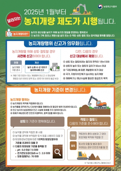 신청 절차는 농업정책과에 농지개량행위 신고서와 사업계획서 농지의 소유권 또는 사용권 입증 서류, 토양분석서 농지개량 기준에 적합한 흙임을 증명하는 서류, 피해방지계획서 등 관련 서류를 제출하면 된다.
