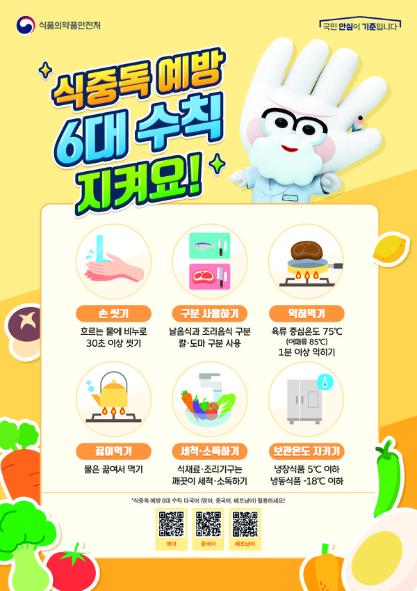 식중독 예방을 위해서는 흐르는 물에 비누를 사용해 30초 이상 깨끗하게 손씻기 끓인 물 마시기 음식물 충분히 익혀 먹기 칼·도마 구분해서 사용하기 식재료·조리기구는 깨끗이 세척·소독하기 등의 수칙을 준수해야 한다.