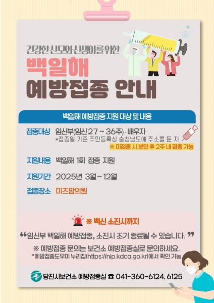 [Ytv영상스토리] 당진시 보건소는 3월부터 임신부와 배우자에게 백일해 예방접종을, 60세 이상 취약계층에는 대상포진·파상풍 예방접종을 무료로 지원한다고 25일 밝혔다.