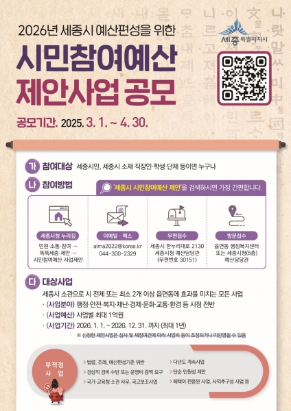 노진욱 예산담당관은 “시민참여예산은 단순히 예산을 제안하는 것이 아니라 시민들이 직접 시정에 참여함으로써 지역사회의 발전을 이끄는 중요한 기회”며 “이번 공모에서 접수된 아이디어가 세종시를 더욱 발전시키는 원동력이 될 수 있도록 시민들의 열정적인 참여를 바란다”고 당부했다.