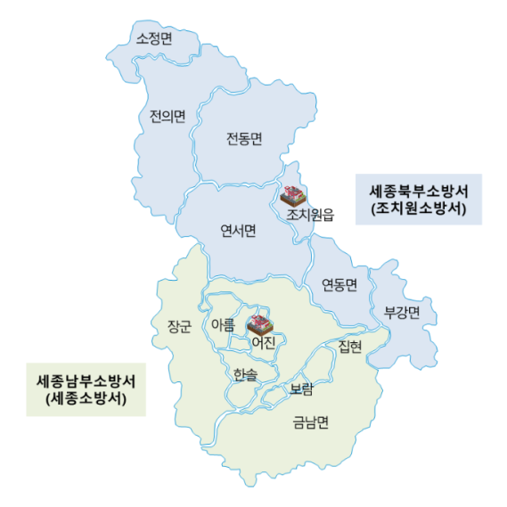 조치원소방서는 조치원읍, 연서면, 전의면 등 세종시 북부 지역을, 세종소방서는 어진동, 보람동, 장군면 등 세종시 남부 지역을 관할하고 있다.