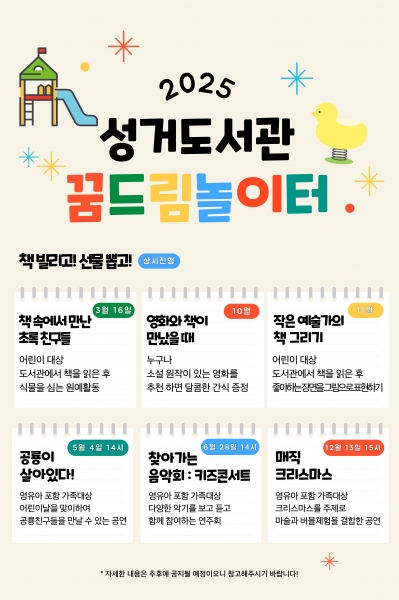 성거도서관 관계자는 “도서관 꿈드림놀이터를 통해 도서관을 이용하는 시민들에게 즐거운 경험이 되기를 바란다”고 말했다.