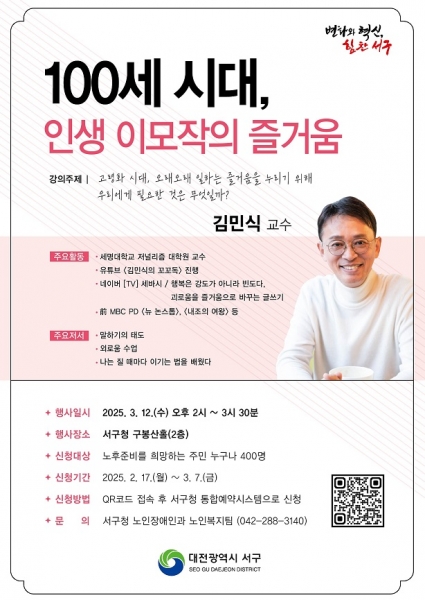 강의는 당일 수요일 오후 2시 서구청 2층 구봉산홀에서 개최되며 유튜브 ‘김민식의 꼬꼬독’과 네이버 TV ‘세상을 바꾸는 시간 15분’에서 노후 준비 관련 강의를 진행하고 있는 세명대학교 저널리즘 대학원 김민식 교수가 진행한다.