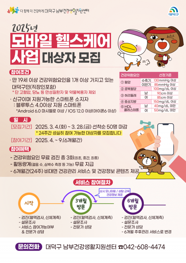 대상자는 건강 위험 요인 중 1가지 이상을 보유하고 있는 만 19세 이상 대덕구민이라면 누구나 참여할 수 있다.
