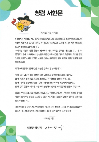 이장우 대전시장은“청렴은 공직자의 기본 책무이자, 시민 모두가 함께 실천해야 하는 가장 중요한 가치”며 “이번 청렴 서한문을 계기로 공직자와 시민이 하나 돼 일류 청렴 도시 대전을 만들어 나가겠다”고 말했다.