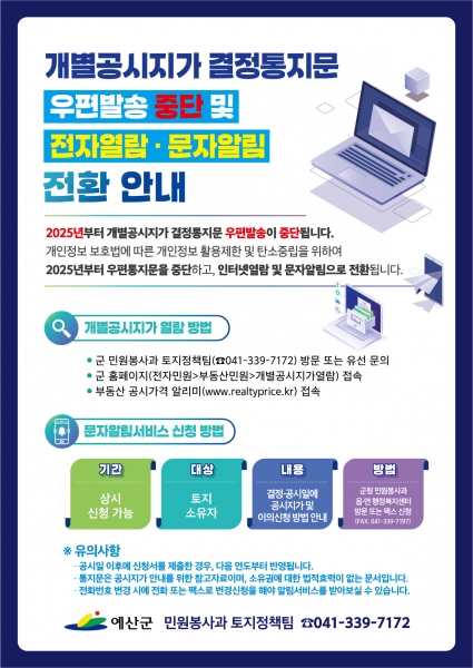 군은 개인정보 보호법 강화로 주민등록번호와 주소 등 개인정보 활용이 제한됨에 따라 올해부터 개별공시지가 우편통지문 발송을 중단하고 문자 알림 서비스 및 인터넷 열람으로 전환한다.