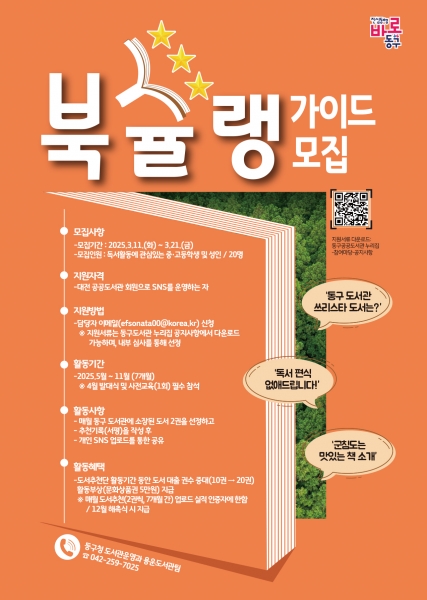 [Ytv영상스토리] 대전 동구는 책을 사랑하고 글쓰기에 관심 있는 구민을 대상으로 ‘동구 도서추천단 북슐랭 가이드’를 운영, 이달 11일부터 21일까지 추천단을 모집한다고 6일 밝혔다.