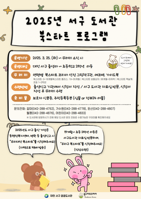 신청 대상은 주소지가 대전 서구인 2025년생 신생아이며 출생신고 시 신고기관에 비치된 책 꾸러미 신청서를 작성해 출생신고서와 함께 제출하면 된다.