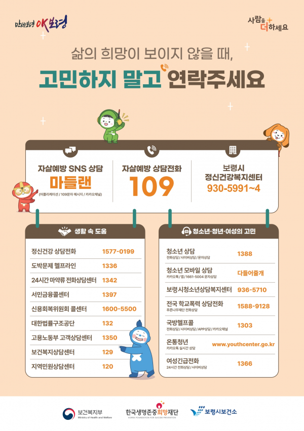 보령시는 불안, 우울 등으로 어려움을 겪는 시민들을 위해 △보건지소·진료소, 읍·면·동 행정복지센터, 아파트 관리사무소에 위기대응 사회서비스 안내문 배부 △중앙시장 등 유동인구 밀집장소에 자살예방 상담 서비스 안내 현수막 게시 △충남도 생명사랑 로고송을 활용한 자살예방 상담전화 109 홍보영상 송출 △스트레스 해소방법 및 도움 기관 정보 카드뉴스 누리집 게시 등을 실시한다.