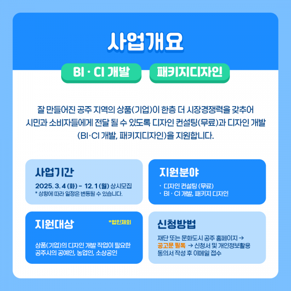 공주시 소재의 소상공인 누구나 신청할 수 있으며 브랜드 이미지 및 기업이미지 개발, 패키지디자인 지원을 통해 지역 상품과 기업의 경쟁력을 높이는 것이 핵심 목표다.