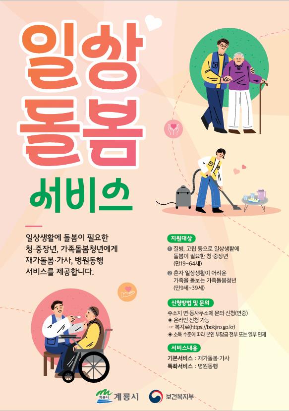 [Ytv영상스토리] 계룡시가 일상생활에서 돌봄이 필요한 시민을 지원하기 위한 ‘일상돌봄서비스’ 이용자를 모집한다고 밝혔다일상돌봄서비스란 돌봄이 필요한 19세부터 64세까지의 청·중장년과 질병 등을 앓고 있는 가족을 돌보거나 그로 인해 생계 책임을 지고 있는 9세부터 39세까지의 가족 돌봄 청년을 대상으로 재가 돌봄, 가사 지원, 병원 동행 등의 서비스를 제공하는 사업이다.