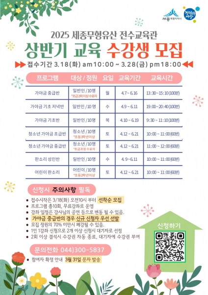 상반기 강좌 신청은 세종시청 누리집 공지사항 또는 홍보물의 정보무늬를 통해 할 수 있으며 선착순으로 마감된다.