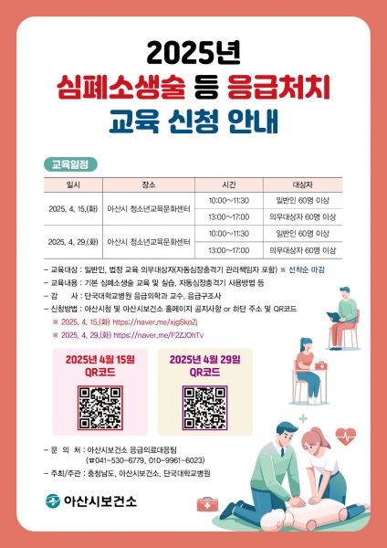 최원경 아산시보건소장은 “이번 응급처치 교육이 나와 내 가족, 주변 사람들의 안전을 지킬 수 있는 중요한 기회가 되길 바라며 많은 관심과 참여를 부탁드린다”고 전했다.