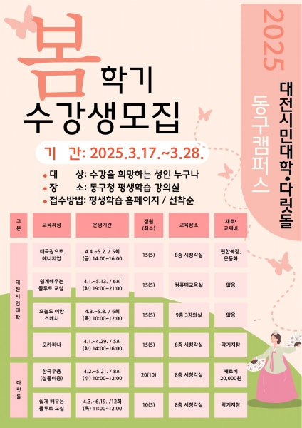 [Ytv영상스토리] 대전 동구는 오는 17일부터 28일까지 ‘2025년 봄학기 대전시민대학 동구캠퍼스’ 수강생을 모집한다고 13일 밝혔다.
