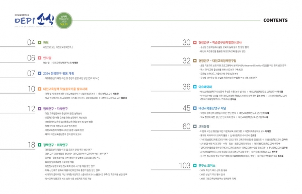 또한, ‘데이터 기반 대전교육정책 수립’ 이라는 대전교육종단연구의 목적에 맞게 학생의 행복감과 학교환경에 대한 근거있는 통찰을 제공한 2편의 대전교육종단연구 저널과 2024년 하반기에 발간한 ‘다문화 시민성 함양을 위한 다문화교육 프로그램’등 7편의 교육동향을 수록했다.
