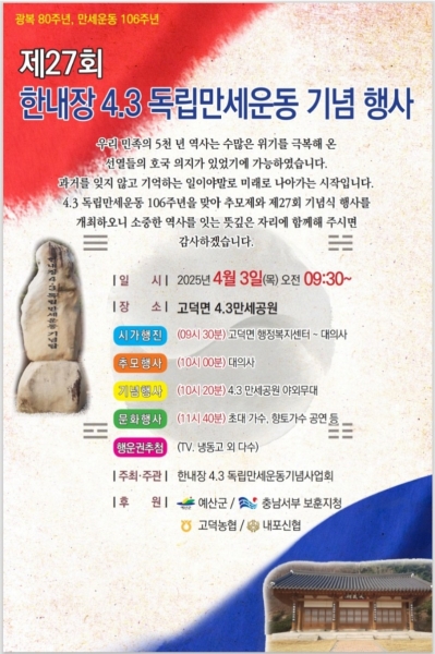 [Ytv영상스토리] 예산군은 제27회 한내장 4·3 독립만세운동 기념행사를 오는 4월 3일 고덕면 한내장터 일원에서 개최한다고 밝혔다.