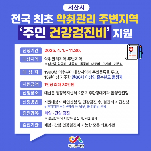 서산시, 전국 최초 악취관리지역 주변지역 ‘주민 건강검진비’ 지원