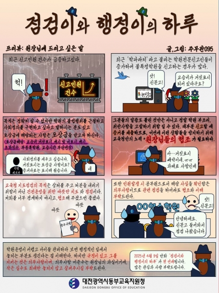 웹툰‘점검이와 행정이의 하루’는 대전동부교육지원청 평생교육체육과 학원관리팀 소속 점검이, 행정이들이 건전한 학원운영을 위한 업무처리 절차 내용을 등을 담은 웹툰이다.