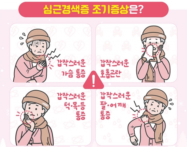 심근경색증 조기 증상은 △가슴 통증 △압박감 또는 짓누르는 느낌 △턱·목 등 부위의 통증과 답답함 △심한 호흡 곤란 △팔이나 어깨의 통증 및 불편함 등이 대표적이다.