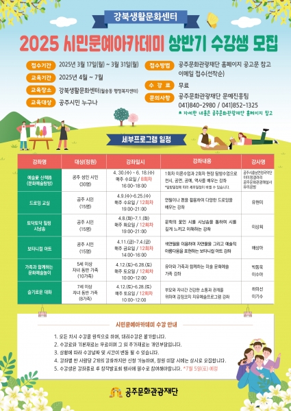 매년 진행되고 있는 강북생활문화센터 시민문예아카데미는 공주시민의 문화향유 확산과 문화예술 참여 기회 제공을 위해 강좌를 운영하고 있다.