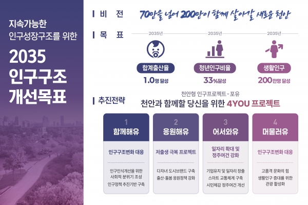 이에 천안시는 인구 70만 돌파를 기점으로 향후 10년간의 지속 가능한 인구구조 안착을 위해 ‘천안과 함께할 당신을 위한 4YOU 프로젝트’를 추진한다.
