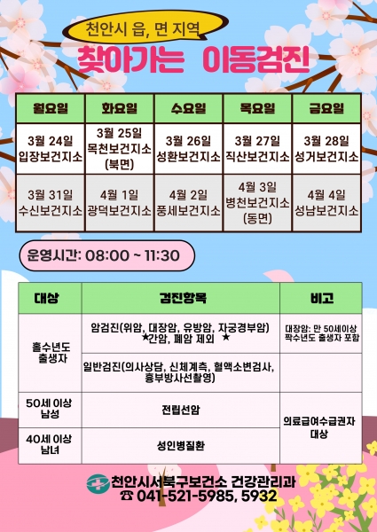 검진 일정은 △3월 24일 입장보건지소 △3월 25일 목천보건지소 △3월 26일 성환보건지소 △3월 27일 직산보건지소 △3월 28일 성거보건지소 △3월 31일 수신보건지소 △4월 1일 광덕보건지소 △4월 2일 풍세보건지소 △4월 3일 병천보건지소 △4월 4일 성남보건지소 순이며 오전 8시부터 오전 11시 30분까지 진행된다.