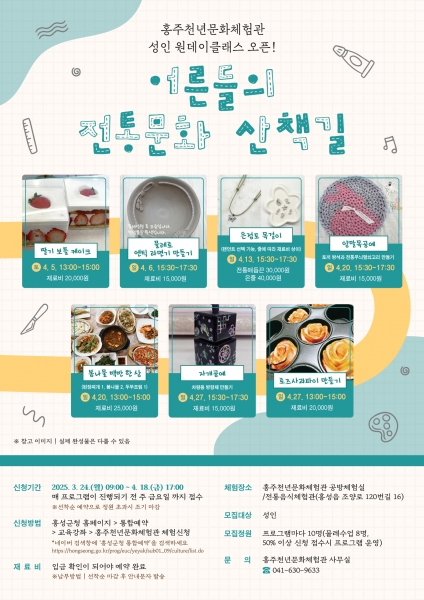 [Ytv영상스토리] 홍성군 홍주천년문화체험관에서는 다음달 5일부터 27일까지 2025년 4월 성인 원데이클래스 ‘어른들의 전통문화 산책길’을 운영한다.