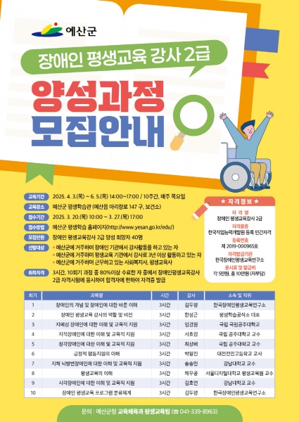 예산군 평생학습관, 장애인 평생교육 강사 2급 과정 수강생 모집