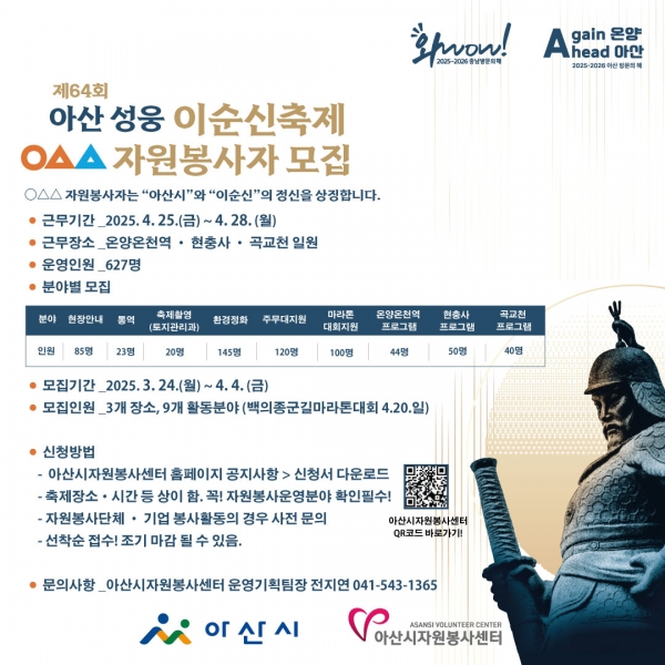 [Ytv영상스토리] 아산시자원봉사센터가 오는 4월 4일까지 ‘제64회 아산 성웅 이순신 축제’에서 활약할 자원봉사자를 모집한다.