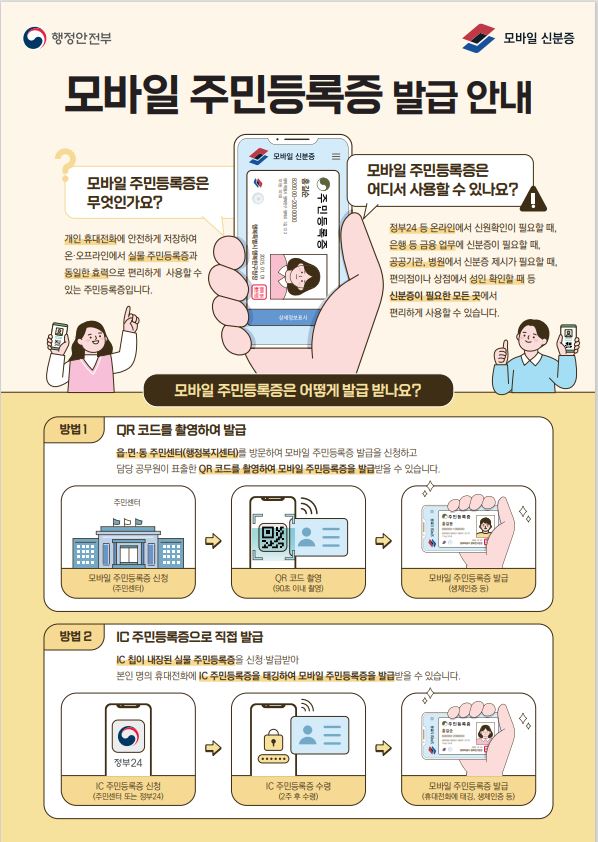 먼저, ‘QR 발급’ 방식은 가까운 행정복지센터를 방문해 1회용 QR 코드를 촬영하면 즉시 모바일 주민등록증이 발급되며 비용은 없다.