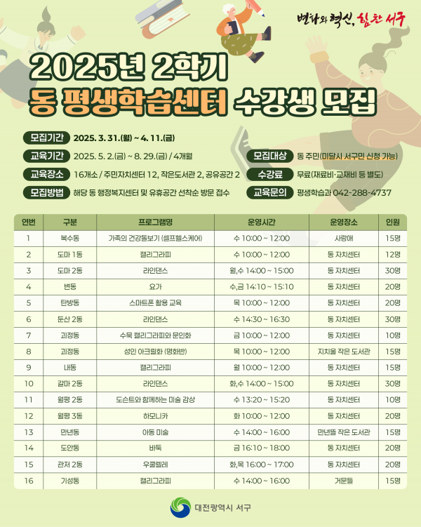[Ytv영상스토리] 대전 서구 평생학습원은 주민들에게 다양한 학습 기회를 제공하기 위해 3월 31일부터 4월 11일까지 동 행정복지센터 및 각종 유휴공간에서 ‘2025년 2학기 동 평생학습센터’ 프로그램 수강생을 모집한다.