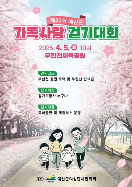 [Ytv영상스토리] 예산군은 ‘제22회 가족사랑 걷기대회’를 오는 4월 5일 오전 10시 무한천 체육공원에서 개최한다.