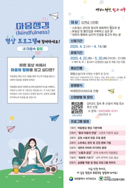 마음챙김 명상 프로그램은 4월 22일부터 5월 20일까지 매주 화요일과 목요일 총 8회차로 진행되며 비대면 방식으로 운영되어 시간과 장소에 구애받지 않고 누구나 편리하게 참여할 수 있다.