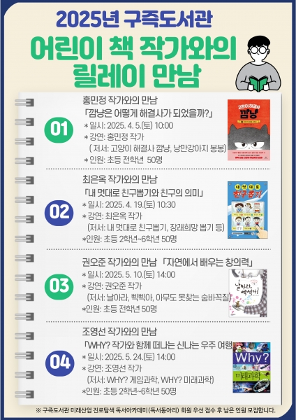작가와의 릴레이 만남은 △4월 5일 ‘고양이 해결사 깜냥’ 홍민정 작가 △4월 19일 ‘내 멋대로 친구 뽑기’ 최은옥 작가 △5월 10일 ‘날아라 삑삑아’ 권오준 작가 △5월 24일 ‘Why? 시리즈’ 조영선 작가 순으로 진행된다.