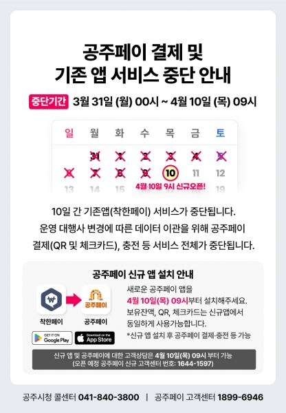해당 기간 정보무늬 결제, 실물 카드 결제, 충전, 환불, 결제취소 등 공주페이 관련 서비스는 모두 중단된다.