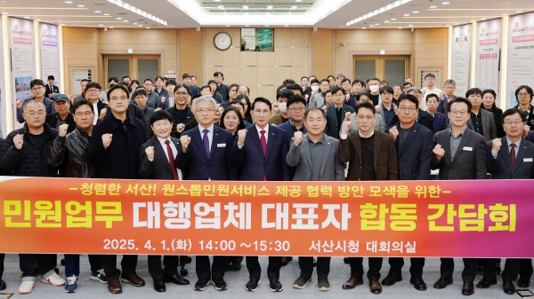 시민만족 원스톱 민원 서비스 제공 방안을 모색하기 위해 열린 이날 간담회는 이완섭 서산시장, 민원업무 대행업체 대표자 등 100여명이 참석했다.