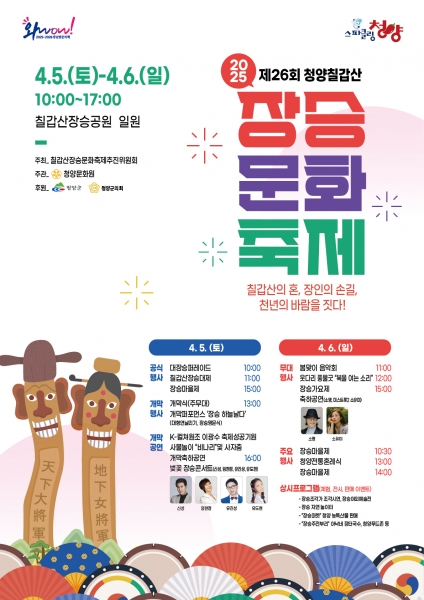 [Ytv영상스토리] 칠갑산 장승문화축제 추진위원회가 주최하고 청양군이 후원하는 제26회 청양칠갑산 장승문화축제가 오는 5일부터 6일까지 이틀간 대치면 장승공원 일원에서 개최된다.
