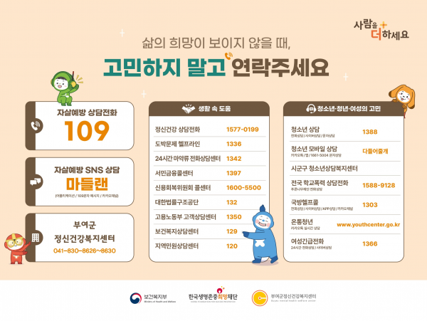 정신건강복지센터장인 김옥선 부여군보건소장은 “3~5월은 겨울철의 우울감이 봄의 밝은 분위기와 대비되면서 상대적 박탈감을 느끼거나 심리적 부담감이 증가할 수 있다.