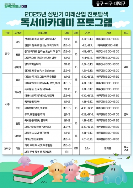 이번 독서아카데미는 한밭도서관 등 17개 도서관에서 초등학생과 중학생을 대상으로 차세대 유망전략산업과 관련한 도서를 선정해 진로 탐색 기회를 제공하고 청소년기 문해력 향상 및 독서율 제고를 유도하는 프로그램이다.