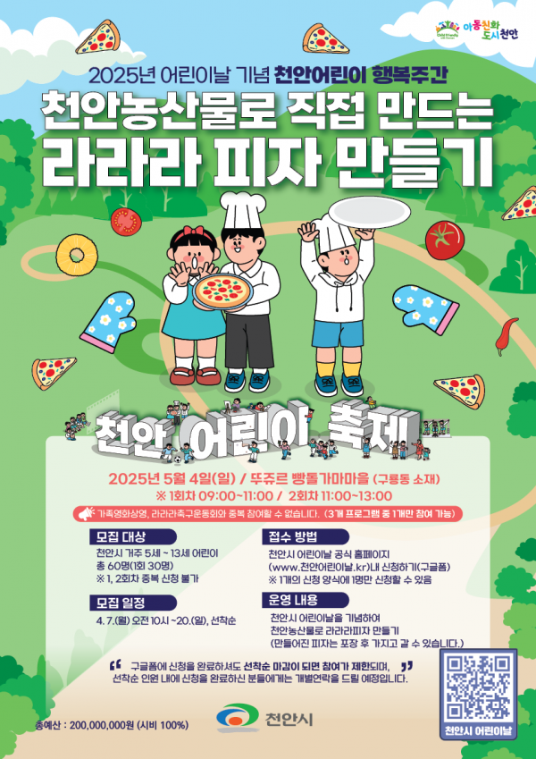 박상돈 천안시장은 “이번 주간행사를 통해 가족과 함께 하는 시간 속에서 아이들이 마음껏 웃고 행복을 느끼기를 바란다”며 “무엇보다도 아이들의 안전을 최우선으로 생각하며 모든 가족이 안심하고 참여할 수 있는 행사가 될 수 있도록 세심히 준비할 것”이라고 말했다.